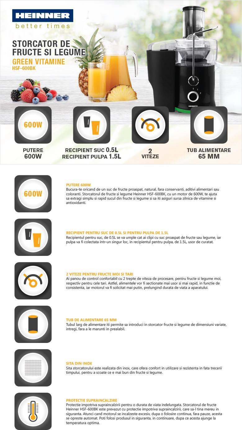 Storcator de fructe si legume Heinner HSF-600BK, putere: 600W, tub de alimentare: 65mm, recipient pulpa: 1.5L, recipient suc: 0.5L, 12000- 14000rpm, sita din inox, 2 viteze, picioruse anti-alunecare, nivel de zgomot: 85dB.