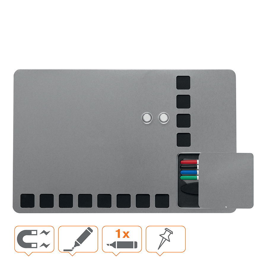 Tabla Nobo Combo este multifuncțională și modernă, design fără ramă. Suprafață argintie magnetică cu spații încadrate cu negru pentru a afișa diverse notițe. Spațiu de depozitare încorporat pentru 4 markere reinscriptibile (roșu, albastru, negru și verde) și un burete de șters, magneți pentru montare și bandă dublu adezivă. 610 mm x 390 mm.