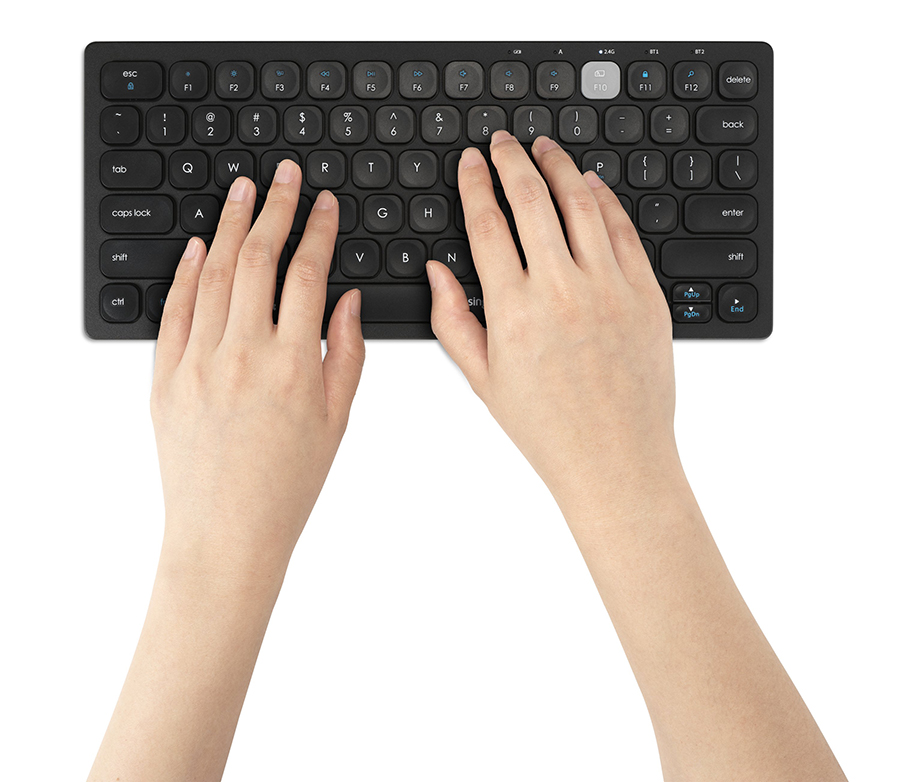 Tastatura compacta cu conexiune wireless duala, va permite sa va conectați si sa comutati intre ele, pana la trei dispozitive simultan (computer, tableta sau telefon), folosind Bluetooth (3.0 sau 5.0) sau wireless de 2,4 GHz cu criptare AES pe 128 de biti