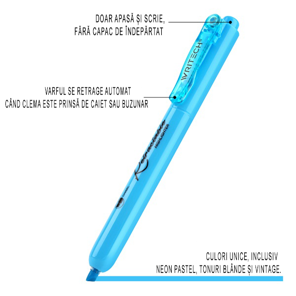 - clipsul de prindere are si rol de siguranta autoretractabila a textmarkerului, daca acesta este uitat deschis si se doreste depozitarea in buzunar