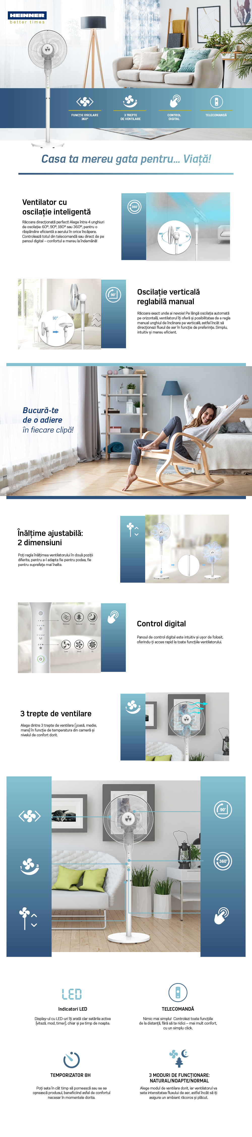Ventilatorul cu picior Heinner este proiectat pentru racorire eficienta si distributie uniforma a aerului in intreaga incapere. Cu oscilatie extinsa pana la 360°, control digital si telecomanda, ofera confort personalizat si utilizare intuitiva.