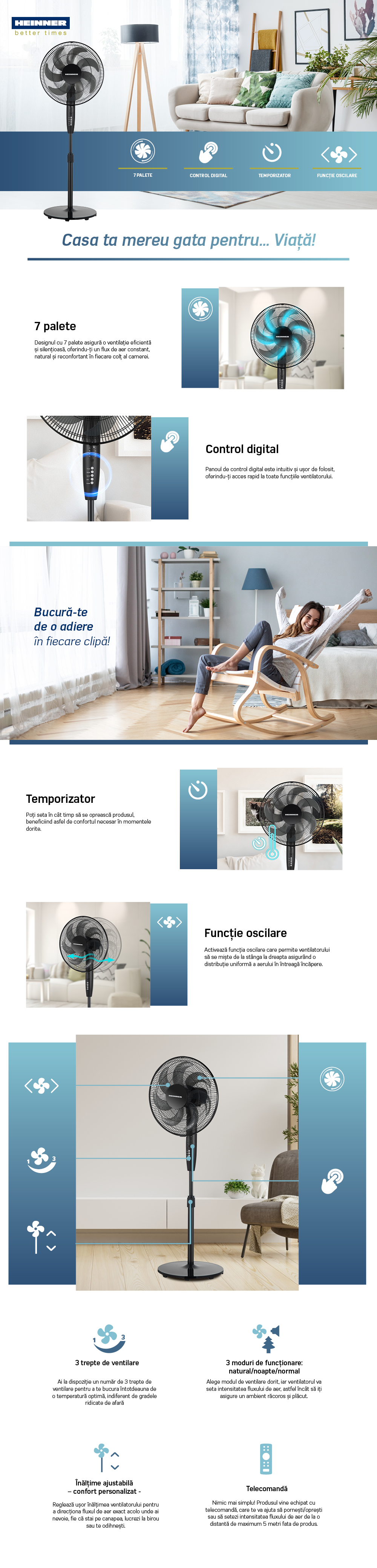 Ventilatorul cu picior Heinner imbina designul modern cu performanta eficienta, oferind un flux de aer constant si placut in zilele calduroase. Cu 7 palete si multiple optiuni de reglare, asigura racorire uniforma in orice incapere.