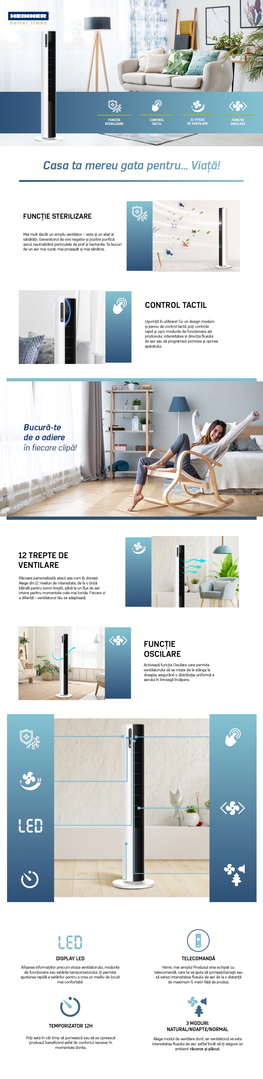 Ventilatorul turn Heinner este mai mult decat o solutie de racorire, fiind echipat cu functie de sterilizare pentru un aer mai curat si mai proaspat. Designul slim si modern il face potrivit pentru orice incapere, oferind performanta ridicata si control precis al fluxului de aer.